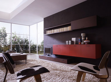 Be Bop - Mobilier pentru living, compus din comoda joasa cu sertare pentru televizor, cu finisaje nuc; comoda suspendata cu 4 sertare, corp suspendat cu polite si dulap cu usa. Mobilierul este realizat din MDF furnituruit. Dimensiune compozitie: 360 x 35.5/45.1/61 x 183,50 cm