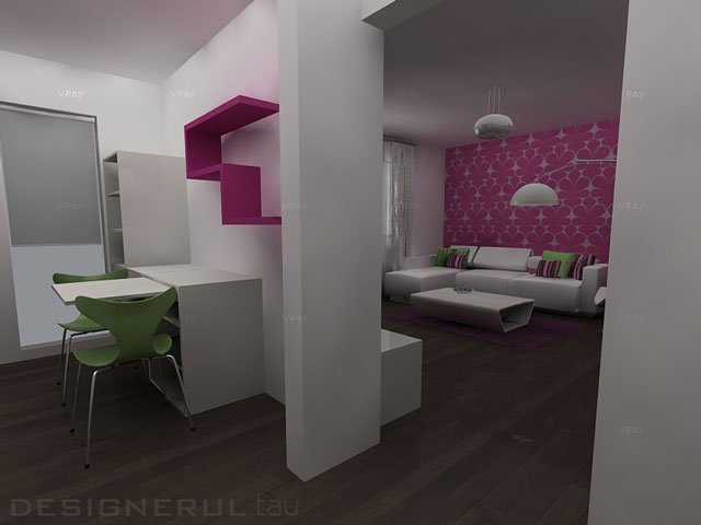 Din punct de vedere cromatic, intregul ambient este dominat de albul stralucitor, cu puternice contraste. Tapetul cu motive florale si covorul in tonuri similare din camera de zi, blatul lucios din bucatarie, sunt in culorile preferate ale proprietarei, insa sunt temperate de un verde crud, prin pernutele decorative si scaune. Intregul design ofera o atmosfera vesela si un aer tineresc garsonierei, pastrand in acelai timp un echilibru intre spatiile de depozitare si cele libere. Avand in vedere ca o garsoniera presupune un spatiu relativ restrans, s-a incercat sa se obtina cat mai multe zone de depozitare, pastrand in acelasi timp un interior aerisit si luminos.