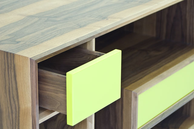Caracteristicile predominante ale acestei piese sunt profilul unghiular de pe margine, care adauga piesei un detaliu inopinat, incadrand obiectele pe care le sustine, si aspectul neobisnuit al politelor si al partitiilor. Acestea sunt oglindite pe partea din spate a cabinetului, ce au atat o latura functionala, cat si una estetica, dulapul putand fi amplasat inclusiv in mijlocul camerei.