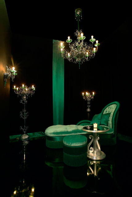 Compozitia prezentata cuprinde: dormeza Sophistiquée, tapisata cu bumbac catifelat esmerald, taburet Sophistiquée, masa cafea si intreaga colectie de corpuri de iluminat Star.