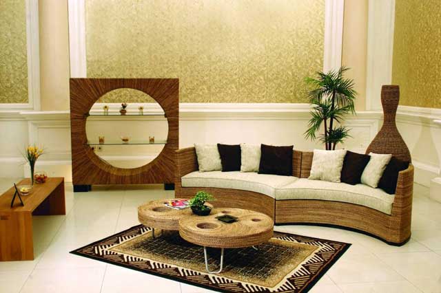 Lesley set - Colectia Lesley este realizata din impletitura naturala de zambila de apa. Mobilierul este lucrat manual. Setul Lesley prezentat cuprinde canapea din doua piese Lesley si masa de cafea. Setul include pernele decorative si cele de pe sezut. Produs in Austria. Pret: 4,275 euro/ set