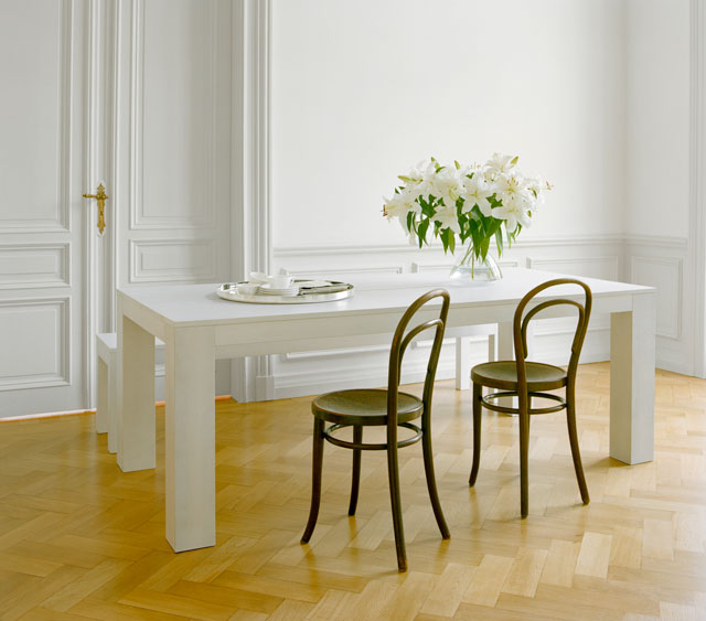 Jane - banca in lemn de stejar lacuit. Dimensiuni: 210/240/270 x 400 x 470 cm. Culori: diverse culori. Design: PHILIPP MAINZER, 2008. Pret: 1583 EUR, fara TVA
