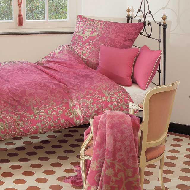 Art. 5026 - Lenjerie de pat decorativa, cu un design foarte elegant si rafinat. 100% bumbac. Disponibila in varianta roz si auriu. Ideala alaturi de pledul decorativ Art. 2638; 150 x 200 cm. Dimensiuni:135 x 200 ; 155 x 200 si 155 x 220 cm. Produs in: Germania. Pret: de la 95.00 euro + TVA/lenjerie si 180.00 euro/pled