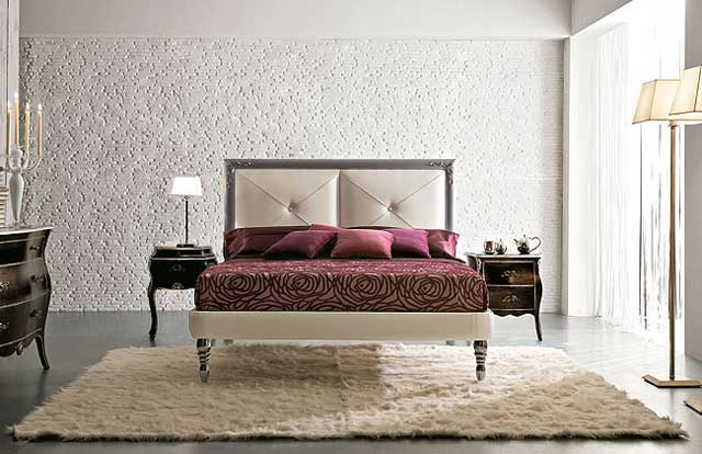 Evelin - Pat tapisat cu piele naturala EP01 si decoratiuni cromate B24. Modelul Evelin este disponibil si in varianta de piele maro PL04 si decoratiuni aurite. Patul este disponibil pe trei dimensiuni: Standard Size, King Size si Super King Size. La comanda, patul este disponibil si tapisat cu materiale textile. Dimensiuni:172 x 199 x 38/130.5 cm sau 192 x 209 x 38/130.5 cm sau 212 x 209 x 38/130.5 cm. Dimensiuni saltea: 160 x 190 cm; 180 x 200 cm; 200 x 200 cm. Pret Pat Standard Size: 2,450 Euro + TVA / pat tapisat cu material textil 2,730 Euro + TVA/ pat tapisat cu piele naturala. Produs in: Italia