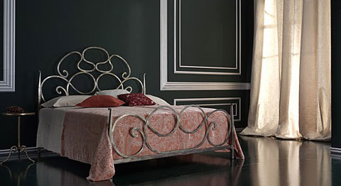 Lione - Pat cu structura din fier forjat, decorat manual. Somiera si saltea ortopedica. Dimensiuni: 167 x 199 x 146 cm sau 167 x 202 x 167 cm. Pret: 1,700 euro (TVA inclus) – fara saltea si somiera. Produs in: Italia