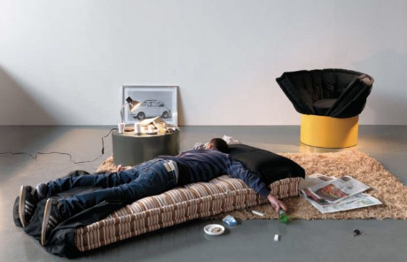 Huggy - fotoliu transformabil in pat, model destinat locuintelor de mici dimensiuni pentru tineri. Model Lago, disponibil prin Morphoza-atelier de interioare.