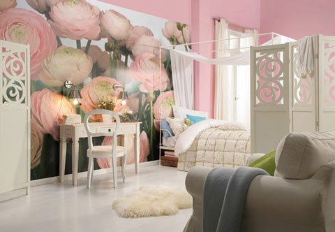 Fototapet Ranunculus Roz - Culori dulci, feminine, pentru un ambient cald. Compozitie tapet disponibila prin intermediul Morphoza-atelier de interioare.