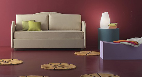 Tiramisu - Canapea – pat, supraetajat; cu brate reglabile, tapisata in spuma poliuretanica si acoperita cu material textil. Structura metalica – pictata. Echipata cu sistem unic, ce transforma canapeaua intr-un pat supraetajat foarte comod. Dimensiuni: 95 x 204 x 105 cm / 95 x 204 x 150 cm. Pret: 2,150 euro + TVA – nu include salteaua inferioara si pernele. Produs in Italia