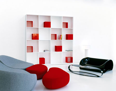 SQ3 - Sistem de rafturi modulare disponibile pe 3 inaltimi – 254 /192 / 130 cm; cu o adancime de 30 cm. Disponibil in alb, in plastic laminat sau lacuit cu vopsea poliuretan mata in alb, negru, rosu sau portocaliu. Dimensiuni: in functie de proiect . Pret: de la 575 euro + TVA. Produs in Italia
