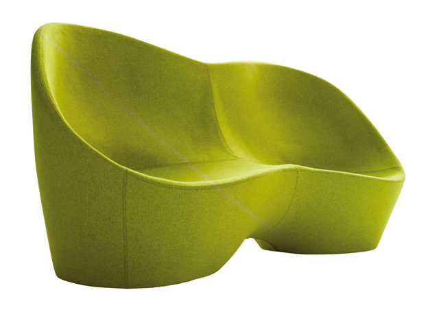 Kouch by Casamania, o canapea transformata in sezlong, cu design avangardist. Produsul este personalizat pe tesatura in culori tari: fucsia si verde crud. Produs disponibil prin intermediul Morphoza-atelier de interioare