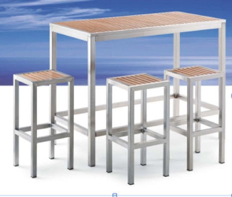 Set pentru bar Bavaria - masuta dreptunghiulara inalta, insotita de scaune de bar: picioare din aluminiu, blat din lemn tratat pentru exterior sau polietilena ce imita lemnul. Produse disponibile prin Morphoza-atelier de interioare.