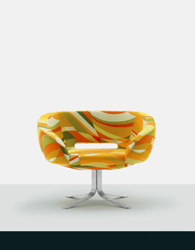 Rive Droite - Design: Patrick Norguet. Fotoliu rotativ cu structura din metal si spuma poliuretanica. Baza din inox. Husa fixa din material textil, piele sau material textil si catifea cu imprimeuri Emilio Pucci. Pret: 2,383 euro fara TVA (mat. Pucci Velvet) si 2,215 euro fara TVA (mat. Pucci Cotton).Intro