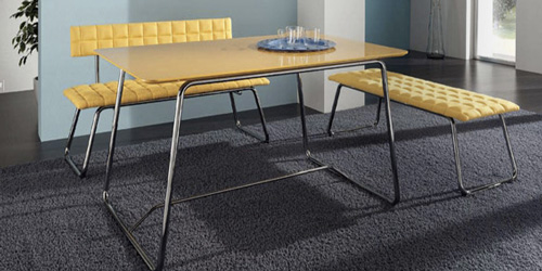 Quito - compozitie de dining Ideal Sedia: masa cu picioare metalice si top din plastic galben, canapele cu picioare metalice si huse din ecopiele galbena. Produse disponibile prin intermediul Morphoza-atelier de interioare.