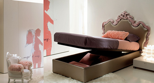 Angel's room by DiLiddo&Perego - camera pentru fetite sau adolescente cu pat din lemn si piele, prevazut cu lada pentru depozitare, dressing pe alb lacuit, cu design Angel's Way roz pal si fotoliu de printesa. Produse disponibile prin intermediul Morphoza-atelier de interioare.