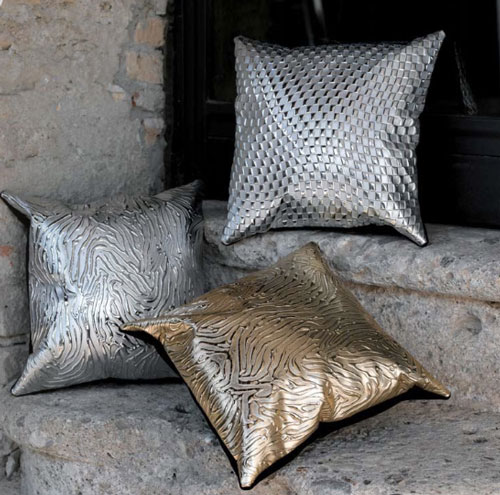 Pepper - Doimo Decor Design, husa cu doua fete: metalica (argintie sau aurie) si neagra. Husa din piele ecologica si poliuretan cu poliester. Dimensiuni 28x28 cm. Disponibil prin Morphoza-atelier de interioare