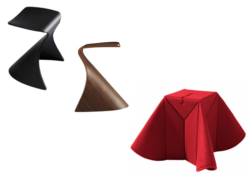 Mirlino by Giancarlo Mino - Taburet din placaj multistratificat curbat. Culori disponibile: nuc si stejar vopsit negru. Dimensiuni: 50,5x41x53 cm. Pret: 482 euro.Gregory by Gregory Lacoua - Gregory este o sofa/scaun care se tranforma intr-un covor (si viceversa), cu un simplu gest. Seduce atat copiii mici sau mari, cat si femeile ce il pot amplasa la masuta de machiaj, sau pe cei care locuiesc in spatii mici (fiind un covor compact ce ofera mai mult spatiu), pe toti poetii ce inca sunt capabili sa viseze, datorita unei idei simple, inedite si geniale, si, in fine, pe cei cu simt practic si gospodaresc, ce vor sa cumpere doua produse intr-unul. Dimensiuni: 75x75x44 cm (iar ca si covor 120x120). Pret: 423 euro.