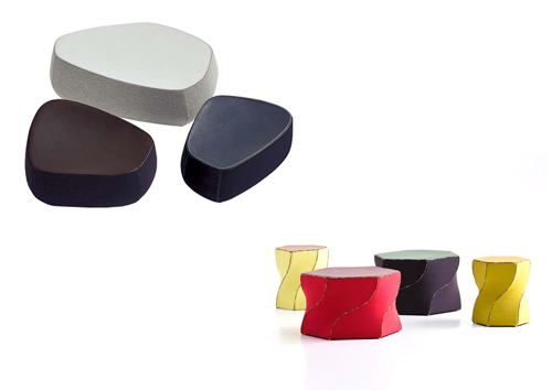 Stanga: Fjord by Patricia Urquiola - Spuma poliuretanica, injectata, cu nucleu de polistiren. Baza din material plastic negru mat, termoformat si rezistent la impact. Acoperit doar cu piele impletita CLASA. Dimensiuni: 44x50x33 cm, 75x55x35 cm, 110x75x38 cm.Dreapta: Twist again by Karmelina Martina - Spuma poliuretanica injectata peste un cadru de lemn de esenta tare. Picioarele sunt pe patine termoplastice. Dimensiuni: 40x36x35 cm, 60x52x38 cm.