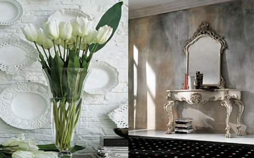 Farfurii decorative albe by Adriani&Rossi. Ceramica cu finisaj lucios sau mat, diverse modele si dimensiuni, piese potrivite pentru realizarea unui decor de perete, cat si pentru a servi pranzul sau cina. Produse Morphoza-atelier de interioareOglinda Glamour by Giorgio Piotto - model baroc, alb, antichizat, pe lemn. Produs Morphoza - atelier de interioare.