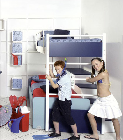 Camera Marinar DiLiddoePerego - set de mobilier pentru camera de copii, construit ca o incapere de pe vapor, in culori specifice - albastru, alb si rosu. Produsele sunt disponibile prin intermediul Morphoza-atelier de interioare.