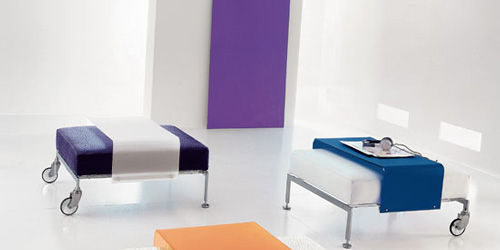 Fly - taburete puf, cu rotile, din metal cromat by Doimo Sofas. Produsul poate fi folosit si ca o masuta, datorita accesoriului din polipropilena, usor transparent, care se ataseaza pufului. Disponibilitate prin Morphoza-atelier de interioare.