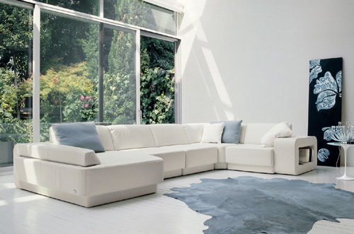 Canard by Doimo Sofas - compozitie canapea, din piele naturala, cu 4 locuri+sezlong, spatiu de depozitare/minibiblioteca in bratul exterior. Modelul se poate asorta cu pernute albe si albastre, pentru un efect vizual estival. Produs Morphoza-atelier de interioare.