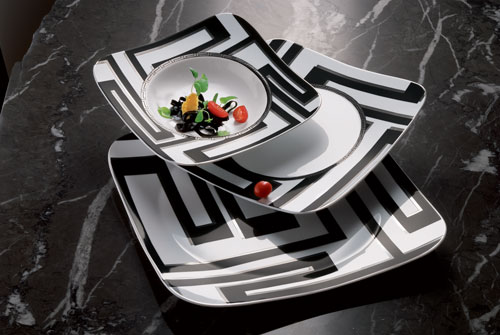 Dedalo - Rosenthal Versace - Farfurii din portelan si portelan platinat Rosenthal Versace, colectia Dedalo, design Casa Versace. Farfuriile fac parte din serviciul de masa pentru 6 sau 12 persoane.- Farfurie intinsa 27 cm – 416,7 lei