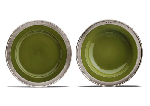 Convivio Green - Farfurie plata pentru cina, cu margini din aliaj metalic si ceramica verde. Design: Alberto Tabellini. Diametru: 27,5 cm. Pret: la cerere. Produs in: Italia.Convicio Green - Bol pentru supa sau paste, realizat din ceramica verde si aliaj metalic. Ideal alaturi de piesele colectiei Convicio Green. Diam. 24 cm. Pret: la cerere. Produs in: Italia.