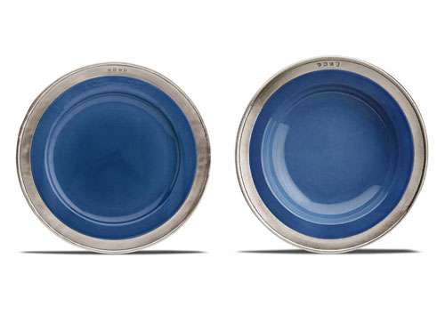 Convivio Blue - Farfurie pentru cina, plata, cu margini din aliaj metalic pe baza de cositor si ceramica albastra. Design: Alberto Tabellini. Diametru: 27,5 cm. Pret: la cerere. Produs in: Italia.Convicio Blue - Bol pentru supa sau paste, realizat din ceramica albastra si aliaj metalic. Ideal alaturi de piesele colectiei Convicio Blue. Diametru: 24 cm. Pret: la cerere. Produs in: Italia.