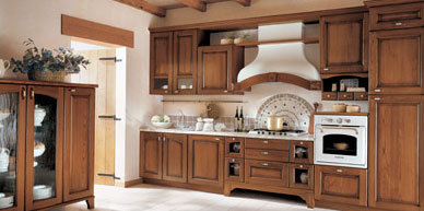 Bucataria Epoca - compozitie Arrital Cucine, pe nuante inchise din lemn. Mobilierul imbina elementele clasice cu cele rustice, nota rustica fiind data de accesorii, cat si de ancadramentul hotei, care imita forma unui horn. Produs Morphoza-atelier de interioare