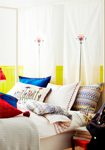 1. BIRGIT - set 2 perdele, 100% bumbac. Designer: Malin Akerblom. L300×Lat60cm. Alb/multicolor. Pret: 39,99 lei.2. BIRGIT RAND - perna. Husa: 100% ramia. Umplutura: 100% poliester. L50×Lat60cm. Albastru. Pret: 59,95 lei.