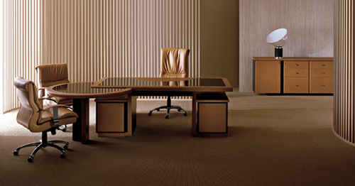 Elite - O colectie destinata amenajarii biroului de la munca sau de acasa, cu piese rafinate si pline de eleganta si stil. Compozitia prezentata propune:- Birou cu extensie pentru conferinta, cu top din sticla ; margini si pad din piele naturala. 260 x 160 x 74 cm / diam. 120 cm