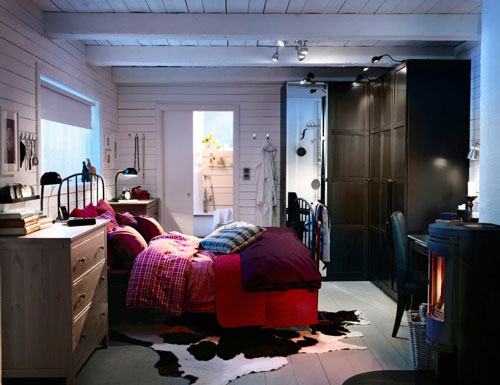 HEMNES - comoda cu 3 sertare. Sertare cu dispozitiv de blocare. Lemn masiv de pin. Lat110×A51, H97cm. Gri-maro. Pret: 549 lei/buc.ALVINE RUTOR - husa pilota si 2 fete de perna. Cu fir vopsit inainte de a fi tesut; da lenjeriei de pat o senzatie placuta la atingere. 100% bumbac. Husa pilota Lat200×L200cm. Fete de perna L50×Lat60cm. Rosu/alb. Pret: 119,95 lei.