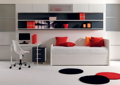 Comp 967 - O camera perfecta pentru un tanar scolar, ce ofera eleganta, simplitate, minimalism incaperii. Compozitia este formata din: - Canapea extensibila – tapisata cu material textil
