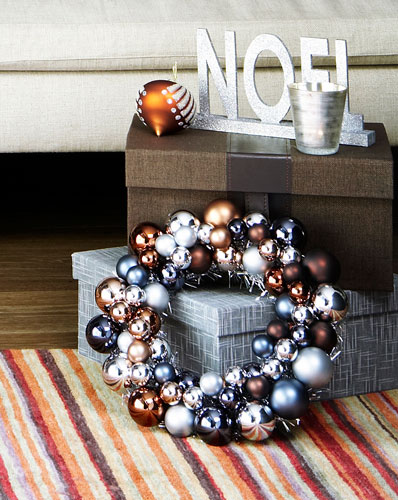 Un alt model de ghirlanda pe care ti-l propunem este cel realizat din globuri. Daca ai prea multe globuri decorative sau nu iti mai plac cele de anul trecut, reutilizeaza-le si prinde-le de un cadru rotund realizat din sarma groasa sau orice material mai rezistent si vei obtine o ghirlanda chic si moderna.Foto: B&Q