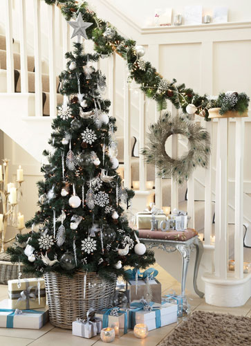 Decoreaza-ti bradul in argintiu sau chiar alb. Accesoriile in aceasta culoare fac trimitere la iarna si vor imprima incaperii o imagine glaciara, iar globurile si decoratiunile in forma de fulgi de zapada o vor accentua si mai mult. Un truc pentru a ascunde ghiveciul sau suportul de brad este sa apelezi la un cos impletit, ca cel din imagine, iar rezultatul va fi unul spectaculos.Foto: Tesco Christmas 2010