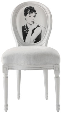 Chair Louis Audrey White - Scaun din lemn cauciucat, blana artificala si bumbac, cu imprimeu Audrey Hepburn. Pret: 1.124 lei.KARE