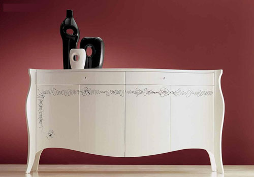 Daysy - Comoda din lemn masiv si lemn curbat, lacuit (mat sau lucios), iar inauntru rafturi de sticla. Pictat manual de artistul Marco Minotti. Dimensiuni: 180x58x92 cm. Pret: intre 6440 si 6740 euro fara TVA. (in functie de finisaj)Moda prin casaitalia