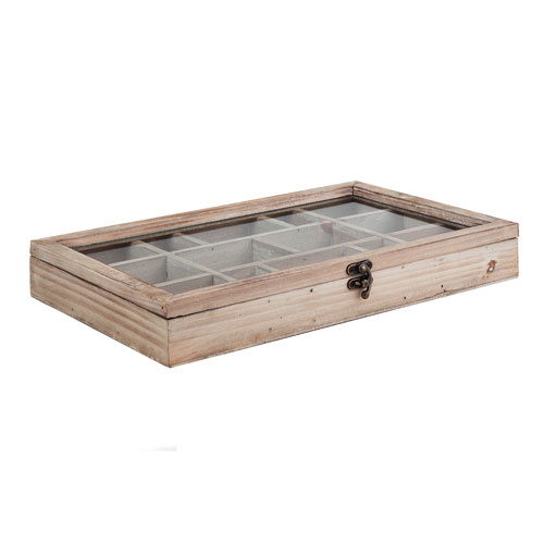 Cutie decorativa compartimentata realizata din lemn si prevazuta cu capac transparent din sticla. O solutie eleganta pentru organizarea bijuteriilor sau altor decoratiuni mici. Cutia este realizata din lemn si sticla. Dimensiuni: 40x25x5,50 cm. Pret: 165 lei.