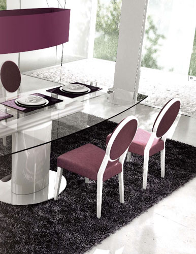 Belem - concept de dining IdealSedia cu scaune cu structura alba din lemn si tapiserie roz. Adaugand o masa transparenta de sticla si un corp de iluminat voluminos, in aceeasi nuanta ca tesatura scaunelor se obtine un spatiu elegant si cald pentru a deservi intreaga familie. Produse Morphoza-atelier de interioare.
