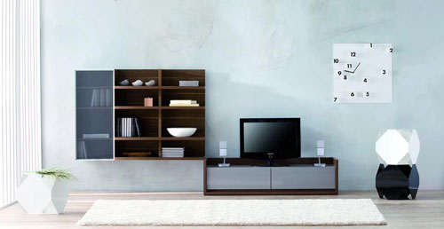 Biblioteca INBOX - Biblioteca compusa din: corp cu usa sticla: L44xA34xH99 cm, panou polite: L99xA32xH99 cm, corp TV: L146xA50xH38 cm. Deschiderea usilor si a sertarelor se face prin tragerea placii de mobilier, nu are manere clasice. carcase din pal melaminat, grosime 28 mm, in culoare nuc. Pret: 1.622 lei (pretul redus este valabil pana pe 30.06.2011, in limita stocului disponibil).Produsul se comercializeaza in magazinele Elvila, www.elvila.ro