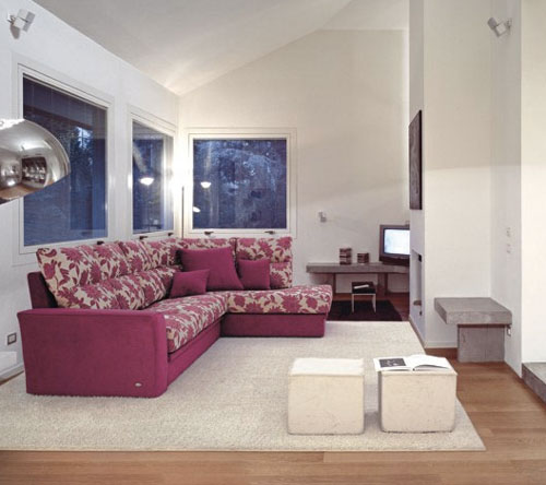 Calipso - canapea cu husa ce combina materialul uni, de culoare roz inchis, cu o tesatura cu imprimeu floral. Combinatia scoate in evidenta pernele folosite atat pentru sezut cat si pentru spatar. Modelul acestui produs se pliaza pe mai multe forme si dimensiuni: canapea de 2 sau 3 persoane, canapea cu sezlong, canapea in forma de "U". Produs Morphoza-atelier de interioare.