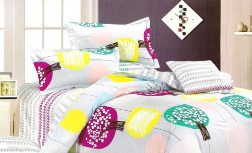 Lenjerie pentru pat dublu din bumbac satinat multicolor cu figuri - Lenjerie din bumbac satinat pentru pat dublu, multicolora, imprimata cu figuri. Cearceaful de pilota si fetele de perna au doua fete distincte: una fond gri imprimata cu copacei multicolori, iar una pe fond alb imprimata cu figuri. Cearceaful de pat este alb imprimat cu figuri. Compozitie: 100% bumbac. Alcatuita din: cearceaf pilota 200x230 cm, cearceaf pat 230x250 cm, fata perna (2 buc.) 50x70+5 cm. Pret: 155 lei.Pentru a vedea mai multe modele de lenjerii de pat, viziteaza www.alyshop.ro