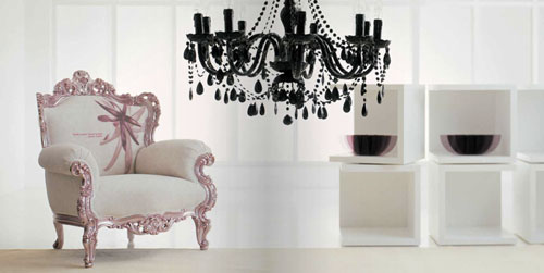 Prince Petalo - fotoliu Moda, cu rama baroc, roz pal si husa din catifea crem cu imprimeu floral roz. Produs Morphoza-atelier de interioare.