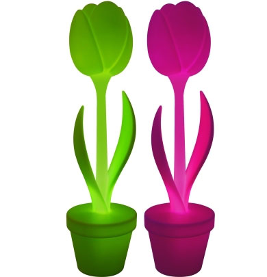 Tulip - Primavara ajunge si in dormitor prin corpul de iluminat S si XL, din masa de plastic colorat - verde crud, fucsia, portocaliu, galben, alb si negru - prin care strabate o lumina discreta. Corpul de iluminat poate fi folosit atat in interior cat si ca lampadar de exterior. Design Myyour, disponibil prin Morphoza-atelier de interioare.
