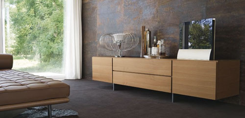 Madie - Comoda TV by Doimo Design din esenta de nuc, cu picioare metalice. Sistem de depozitare cu 2 sertare si doua rafturi inchise. Produs disponibil prin Morphoza-atelier de interioare.