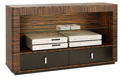 Vogue PSH 5174 - Comoda TV Selva, 139X40/82 cm, cu doua sertare si un raft reglabil de sticla, finisaj zebrano. Produs disponibil prin Morphoza-atelier de interioare.