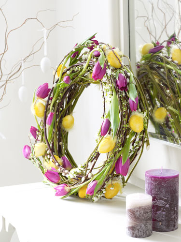 Daca iubesti florile, atunci este ocazia potrivita pentru a face pentru masa de Paste o ghirlanda din flori, cu atat mai mult cu cat s-a dovedit faptul ca florile au capacitatea de a creste apetitul. Aceasta ghirlanda va pune in valoare intregul aranjament, va insufleti incaperea si iti va incanta invitatii cu parfumul florilor sale. Pentru suport, te poti folosi de acelasi tip de crengute (pot fi chiar unele de salcie) sau il poti realiza din sarma, rasucind-o de mai multe ori. In ceea ce priveste florile, foloseste unele de sezon, in mai multe culori, putand fi chiar de soiuri diferite. Florile le poti prinde cu niste sfoara sau, pentru un aspect elegant, cu niste panglici.Foto: Interflora