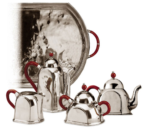 VIKINGHI - Set compus din supot pentru zahar 17x11,5 cm, ceainic 19,5x15 cm, cafetiera 18,5x19 cm, suport pentru lapte sau frisca 13x9 cm si tava 43,5x29 cm; toate realizate din aliaj metalic. Design Alberto Tabellini. Pret: la cerere. Produs in Italia.In exclusivitate prin Interior Store