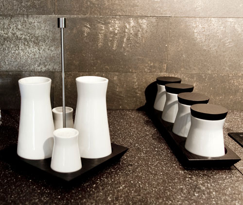 Accesorii masa, marca Adriani e Rossi - set pentru ulei, otet, sare si piper + set recipiente pentru mirodenii. Accesoriile sunt din portelan cu masa lemnoasa, wenge.Morphoza-atelier de interioare