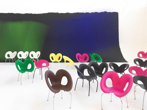 Ripple Chair by Ron Arad - Cadrul scaunului Ripple Chair este fabricat termoplastic injetat natural, alb lustruit, pentru a evidentia proiectarea in relief, care de fapt este o reminiscenta a urmelor lasate de valurile marii pe nisip. Deschiderea circulara a scaunului, lejeritatea si catifelarea liniilor, fermitatea materialului utilizat si modul de stivuire fac din Ripple Chair potrivit atat pentru spatii publice cat si in amenajarea unei case. Dimensiuni: 68x59x80 cm. Pret: la cerere. Moroso prin casaitalia